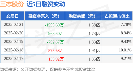 本站消息,2月21日,三态股份(301558)融资买入3248.61万元,融资偿还4804.21万元,融资净卖出1555.6万元,融资余额1.58亿元。